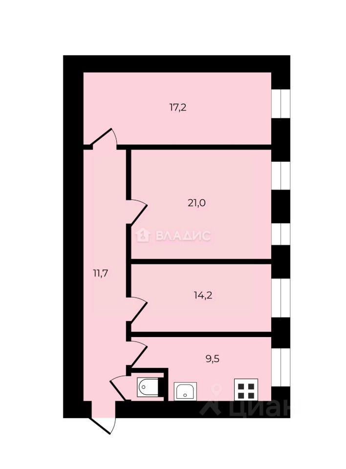 Жилая площадь составляет 52,4 кв. м, площадь кухни — 9,5 кв. м. Три комнаты имеют площадь 17,2 кв. м, 21 кв. м и 14,2 кв. м соответственно.