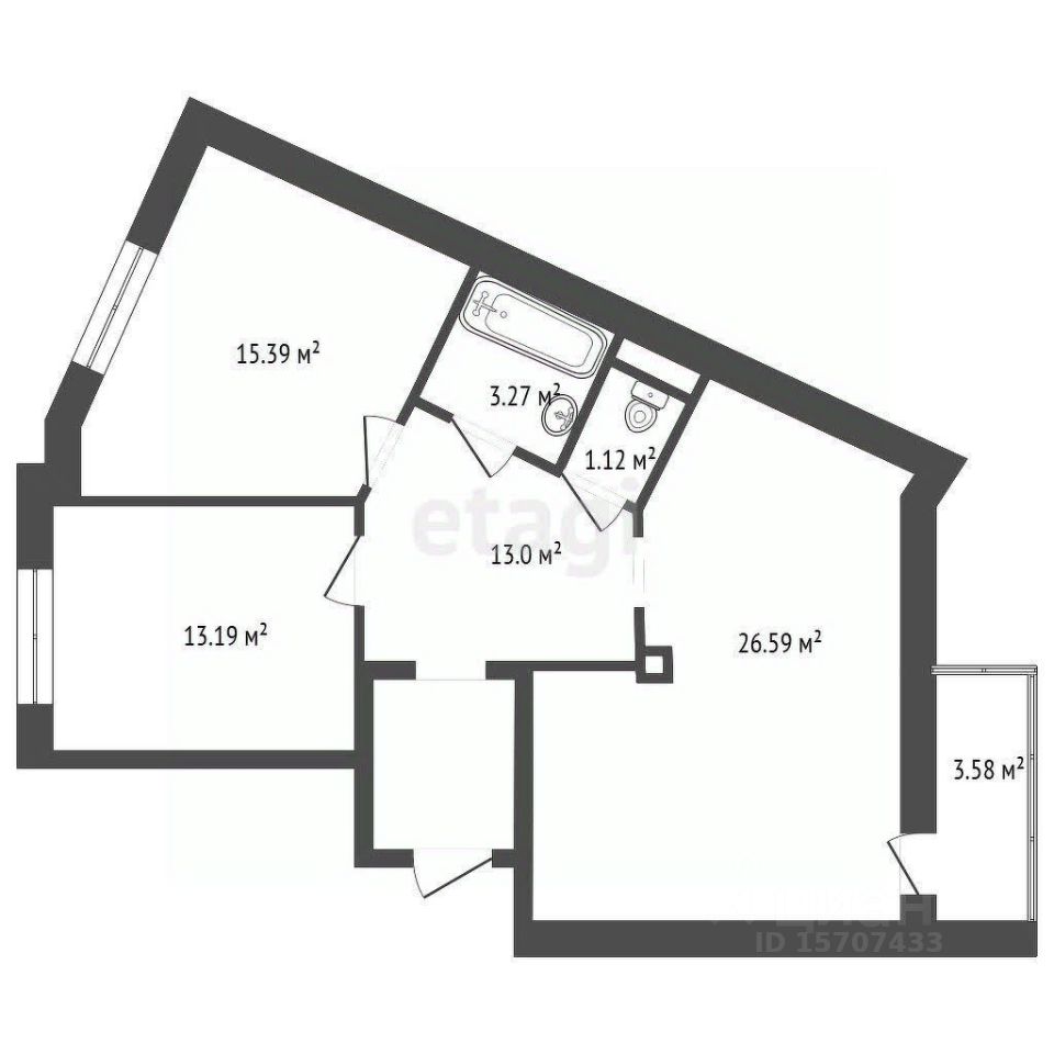 -Две изолированные комнаты (13.19 кв.м. + 15.39 кв.м. ) Из большой кухни гостиной (26.59 кв.м.) открывается выход на балкон площадью ( 3.58 кв.м.)