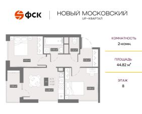 Цена со скидкой до 30% в прямой продаже от застройщика — только в этом месяце. Беспроцентная рассрочка. 2-к квартира в ЖК Up-квартал "Новый Московский" на 8-м этаже. Общая площадь 44,82. Чистовая отделка.