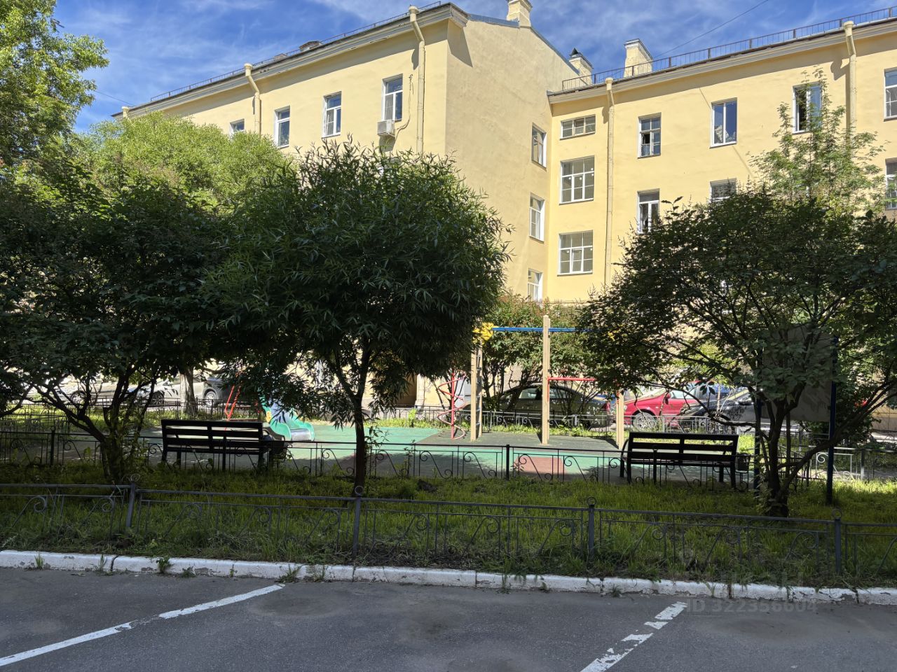 Широкий парадный вход, благоустроенный зеленый двор с парковкой.