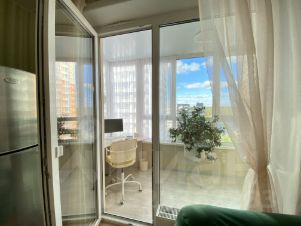 * Лоджия утепленная 9 м² с освещением, рабочим местом, настенной сушилкой 2 м, шторами и двумя выходами из кухни и комнаты, полками для хранения,