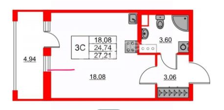 - Квартира студия европланировки площадью 24,74 кв м + лоджия 3,73 кв м,