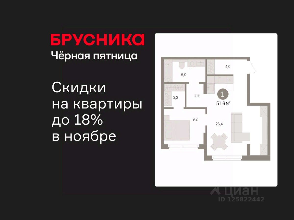 1-комн. квартира от застройщика с предчистовой отделкой в ЖК "Брусника в Новоселье" на 1 этаже. Общая площадь: 51.64 кв.м. Высота потолков 2.7 м.