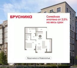 1-комн. квартира с предчистовой отделкой в ЖК "Брусника в Новоселье" на 1 этаже. Общая площадь: 51.64 кв.м., жилая: 9.2 кв.м., площадь просторной кухни-столовой: 26.4 кв.м. Все окна выходят на одну сторону. В квартире один совмещенный санузел. Высота потолков 2.7 м.