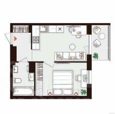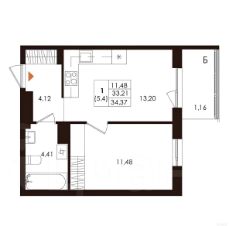 - 34,4 кв. м, просторная кухня - 13.2 кв. м., комната - 11,48 кв. м. с выделенной гардеробной зоной