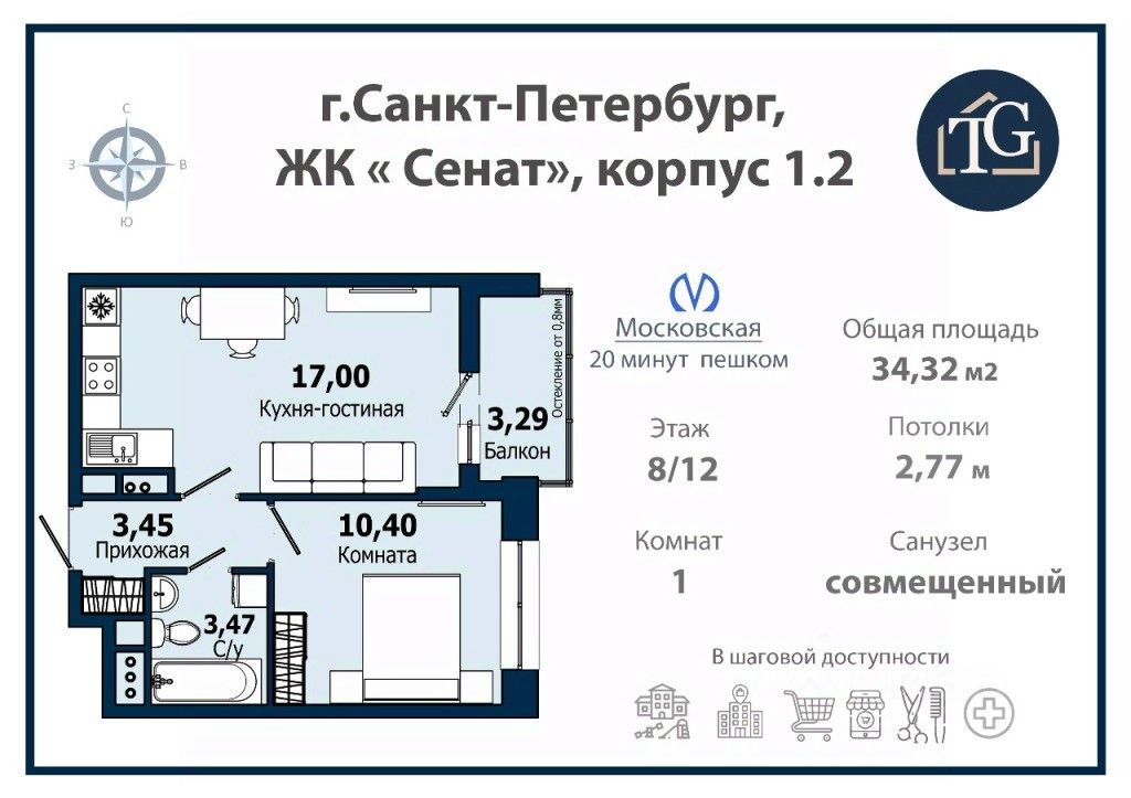 В продаже однокомнатная квартира в ЖК Сенат от SetlGroup в Московском районе.
