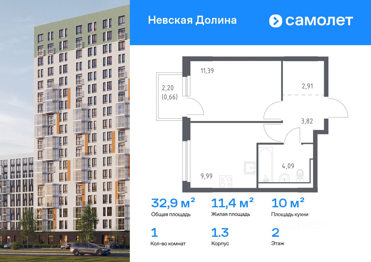 Строим кварталы для жизни с заботой о будущем. Предлагается 1-комнатная квартира комфорт-класса 32,86 кв.м в корпусе 1.3 на 2 этаже, в ЖК "Невская Долина"