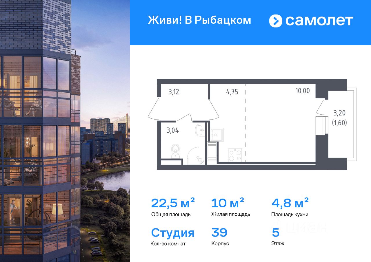 Предлагается квартира студия комфорт-класса 22,51 кв.м в корпусе 39 на 5 этаже, в ЖК "Живи! В Рыбацком"