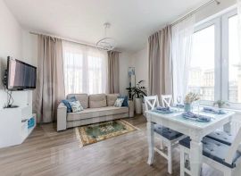 Новая, светлая евродвушка с дизайнерским ремонтом и чудесным видом на Петербург и Неву. Каждое утро здесь встречает солнце над водой, а вечера дарят золотые закаты и огни большого города.