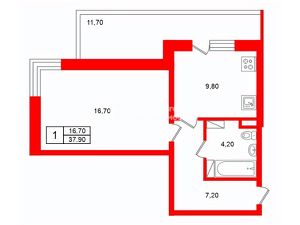 Просторная комната 16,7 метров и правильной формы кухня 9,8 м.