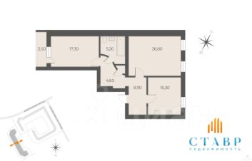 Общая площадь 81,6 кв.м. Кухня - 16,3 кв.м, комнаты изолированные 17,3 кв.м с выходом на лоджию и 26,8 кв.м. С/у совмещенный.
