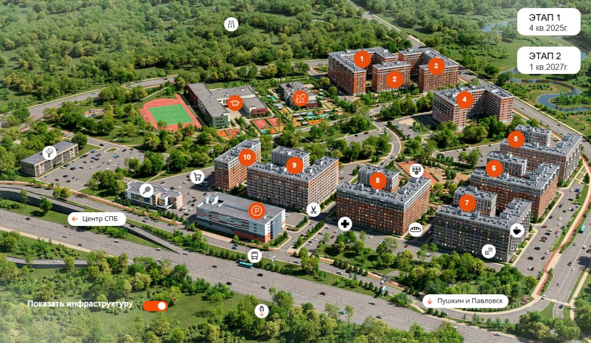 ЖК Новый Московский - 10 корпусов высотой от 6 этажей . В оформлении стен зданий используется навесной вентилируемый фасад с облицовкой керамогранитом природных оттенков. Вход в парадную осуществляется с уровня земли. Общие зоны отличает авторский дизайн, сочетающий природную эстетику и современный технологический подход. Яркая навигация, качественные материалы. В каждой парадной есть колясочная комната и установлены современные скоростные лифты. Закрытая охраняемая территория с контролем доступа и системой видеонаблюдения, с возможностью вывода всех камер на смартфон жителя. Собственная инфраструктура: детский сад, школа, кабинеты врачей, пункт полиции, физкультурно-оздоровительный центр, отдельно стоящий паркинг на 6 уровней с лифтами . Пешеходный променад . ЖК расположен в Пушкинском районе. Рядом есть все необходимое: учебные заведения, медицинские учреждения, крупнейшие в районе ТРК, фитнес клубы, кафе. КАД в 20 минут транспортом. Аэропорт и Невский лесопарк в 30 минутах транспортом. До метро Шушары можно добраться за 15 минут на автомобиле. К заселению первых корпусов квартала будет запущена выделенная линия скоростного трамвая Славянка, которая соединит микрорайон и станцию метро Купчино. Трамвай-экспресс - это современные вагоны с Wi-fi и гарантированное отсутствие пробок. Новая точка притяжения Петербурга В ближайшие годы район рядом с Новым Московским будет развиваться уникальными темпами и городом в городе, где вся инфраструктура — на расстоянии короткой прогулки. Драйвером изменений станет масштабный проект нового кампуса СПбГУ около Пушкина. Новый университетский город — это не только учебные корпуса и лаборатории, но и корпуса академической гимназии, гостиницы, конгресс-центр, спортивный центр, каток и многое другое. Жизнь в таком окружении не только комфортна, но и престижна. Недвижимость здесь будет крайне востребована и заметно вырастет в цене. Реализация проекта уже началась — к 2026 году здесь уже появится учебные корпуса , кафе и другая инфраструктура. Всего кампус займет более 200 гектар и станет одним из крупнейших проектов такого рода в России.