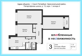 Предлагается в продажу трехкомнатная квартира общей площадью 63,5 кв. м, расположенная на 7 этаже. Планировка квартиры включает в себя кухню (10,2 кв.м) и три жилых комнаты (10,7 + 13,3 + 17,5 кв. м.), совмещенный санузел.