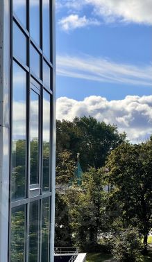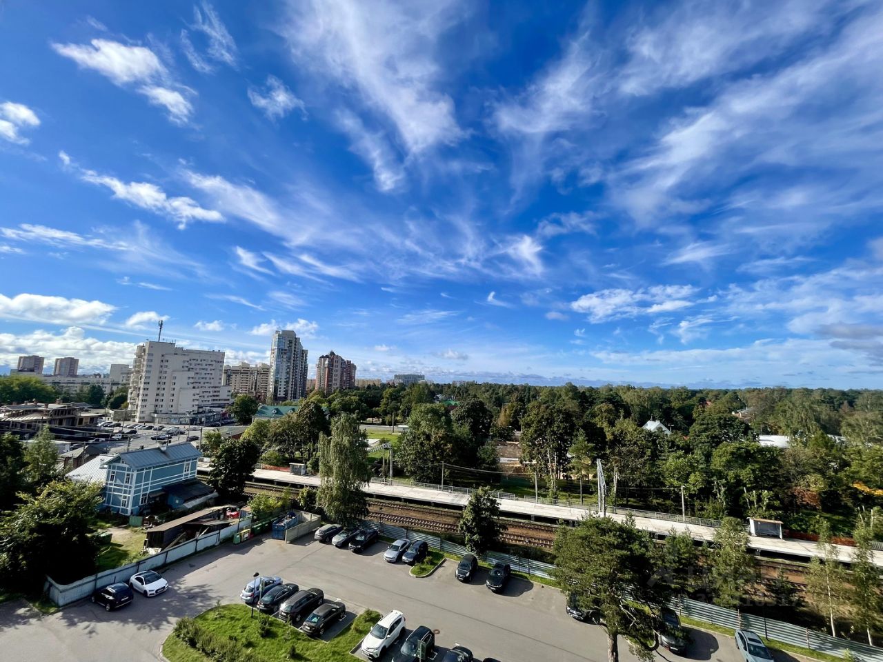 Из окон открывается красивый вид на город, утопающий в зелени.