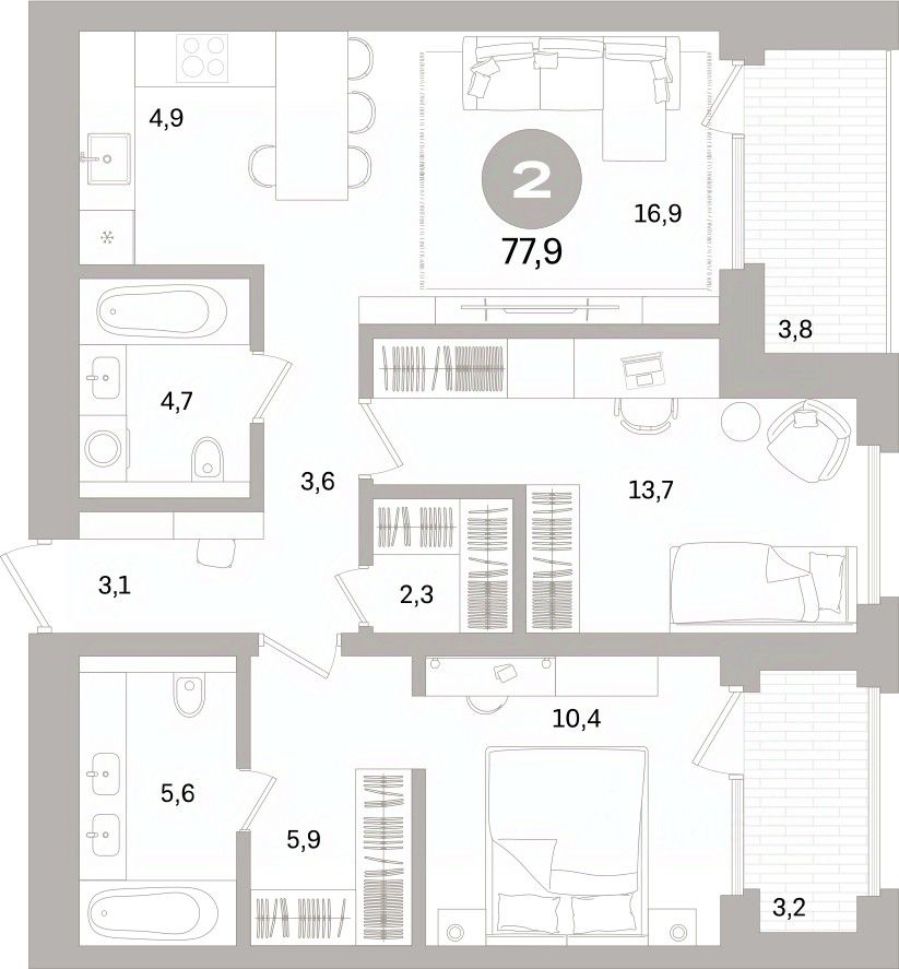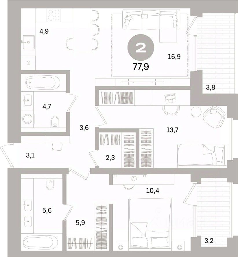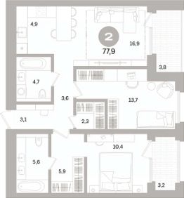 2-комн. квартира с предчистовой отделкой в ЖК "Северный ветер" на 7 этаже. Общая площадь: 77.93 кв.м., жилая: 24.1 кв.м., площадь просторной кухни-столовой: 21.8 кв.м. Комнаты изолированные, все окна выходят на одну сторону. В квартире две лоджии, два совмещенных санузла. Высота потолков 3.1 м.