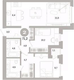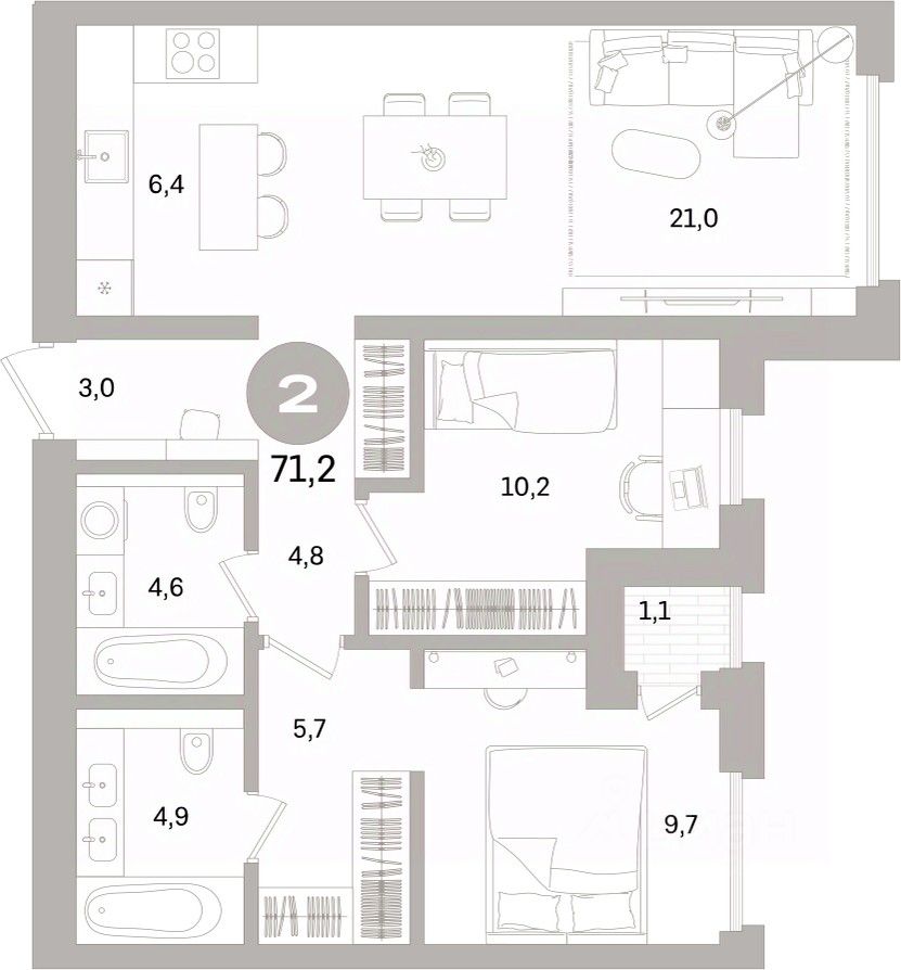 Продается двухкомнатная квартира от застройщика с предчистовой отделкой в ЖК "Северный ветер" на 11 этаже. Общая площадь: 71.15 кв.м., жилая: 19.9 кв.м., площадь просторной кухни-столовой: 27.4 кв.м. Комнаты изолированные, все окна выходят на одну сторону. В квартире одна лоджия, два совмещенных санузла. Высота потолков 3.1 м.