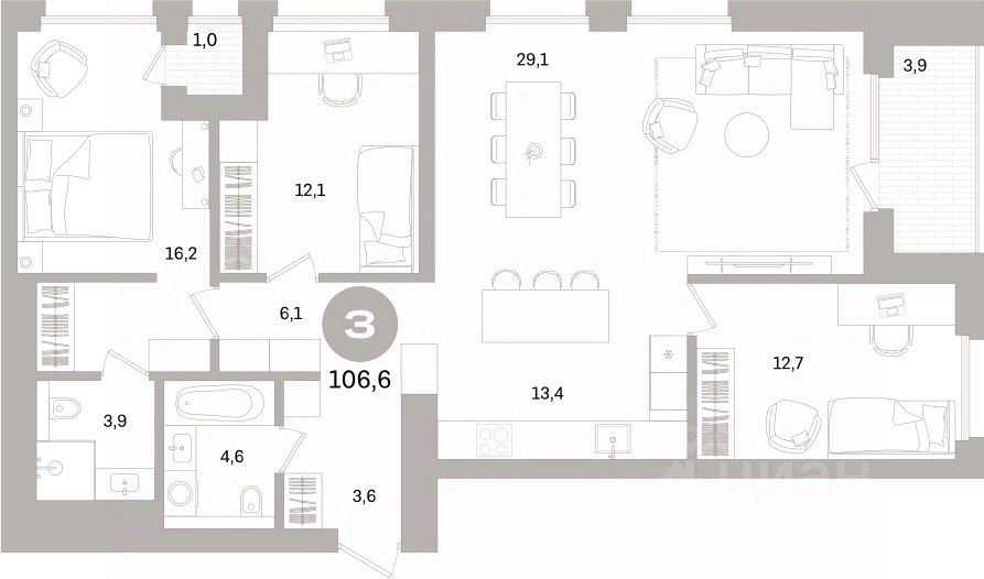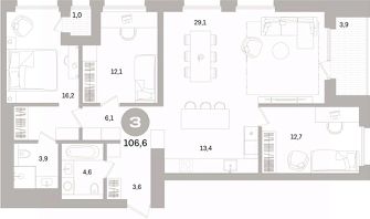 3-комн. квартира с предчистовой отделкой в ЖК "Северный ветер" на 7 этаже. Общая площадь: 106.58 кв.м., жилая: 41 кв.м., площадь просторной кухни-столовой: 42.5 кв.м. Угловая квартира, очень светлая, естественная вентиляция при открытии окон. В квартире две лоджии, два совмещенных санузла. Высота потолков 3.1 м.