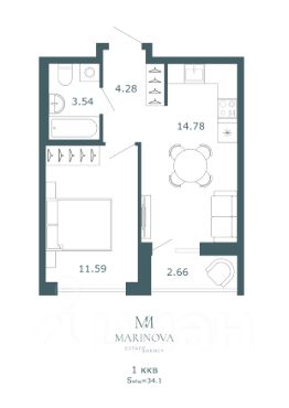 Общая площадь квартиры 34,1 кв.м. без лоджии. Расположена на комфортном 5 этаже кирпично-монолитного дома.