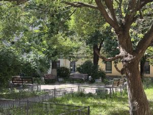 Широкий парадный вход, благоустроенный зеленый двор с парковкой.