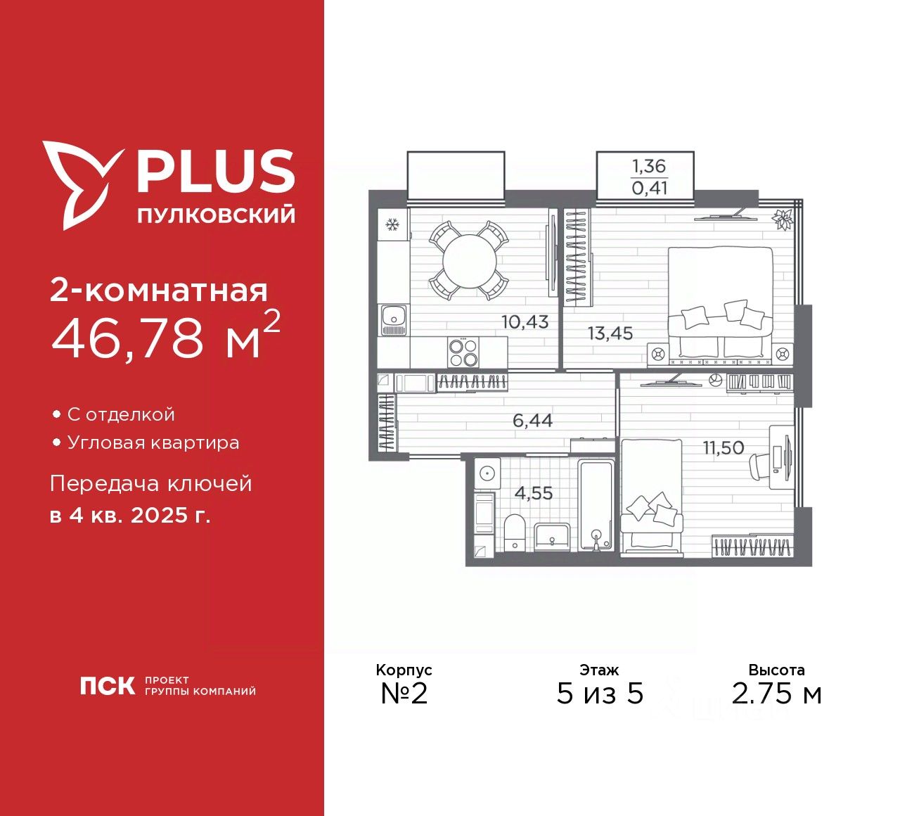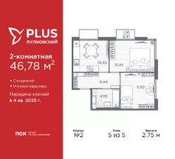 Продается 2-комн. квартира от застройщика с отделкой в ЖК "PLUS Пулковский" на 5 этаже. Общая площадь: 46.78 кв.м., жилая: 24.95 кв.м., площадь просторной кухни-столовой: 10.43 кв.м. Квартира угловая, окна oбecпeчивaют paвнoмepнoe ocвeщeниe в тeчeниe дня. В квартире один балкон, один совмещенный санузел. Высота потолков 2.75 м.