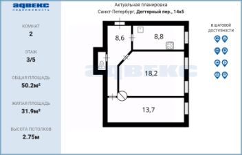 Потенциал для реализации проектов: Общая площадь квартиры составляет 50,2 кв.м, жилая - 31,9 кв.м, высота потолков - 2,75м. Возможна перепланировка для создания комфортного и современного пространства.