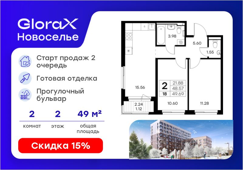 Продается 2-комн. квартира на 2-м этаже в строящемся проекте комфорт-класса GloraX Новоселье. Общая площадь лота составляет 49,69 кв. м, из которых 21,88 кв. м отведено под жилую и 15,56 кв. м под кухонную зону. Номер квартиры - 18
