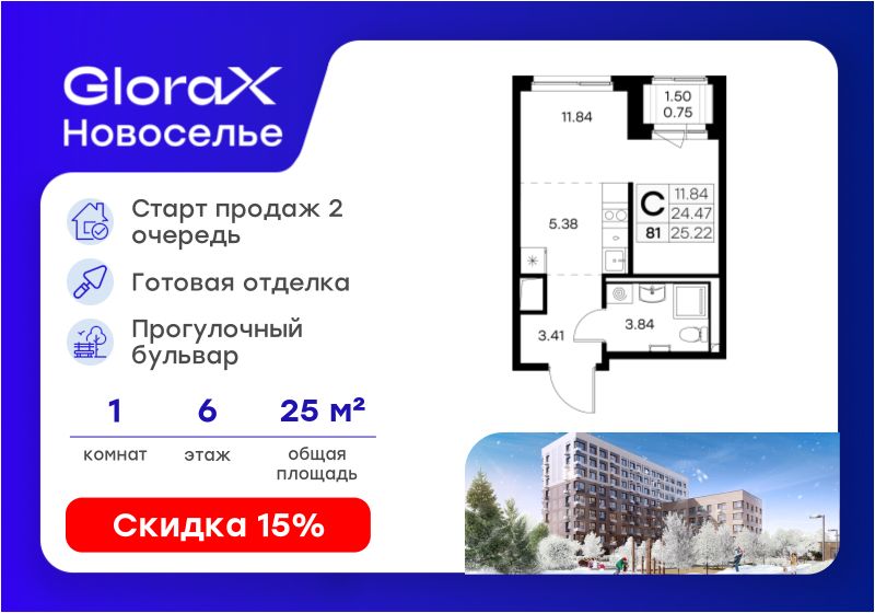 Продается квартира-студия на 6-м этаже в строящемся проекте комфорт-класса GloraX Новоселье. Общая площадь лота составляет 25,22 кв. м, из которых 11,84 кв. м отведено под жилую и 5,38 кв. м под кухонную зону. Номер квартиры - 81