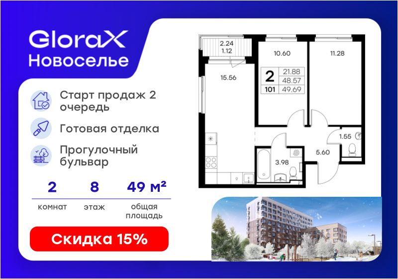 Продается 2-комн. квартира на 8-м этаже в строящемся проекте комфорт-класса GloraX Новоселье. Общая площадь лота составляет 49,69 кв. м, из которых 21,88 кв. м отведено под жилую и 15,56 кв. м под кухонную зону. Номер квартиры - 101