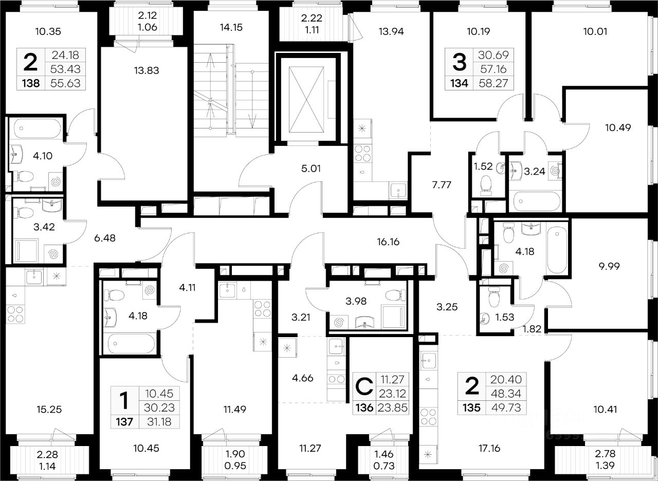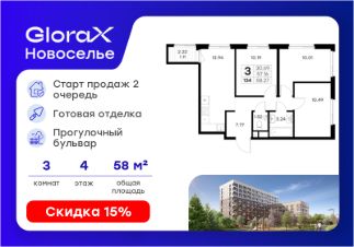 Продается 3-комн. квартира на 4-м этаже в строящемся проекте комфорт-класса GloraX Новоселье. Общая площадь лота составляет 58,27 кв. м, из которых 30,69 кв. м отведено под жилую и 13,94 кв. м под кухонную зону. Номер квартиры - 134