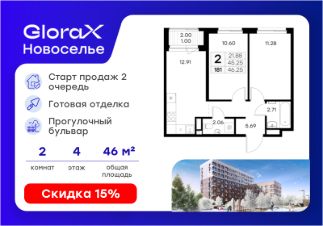 Продается 2-комн. квартира на 4-м этаже в строящемся проекте комфорт-класса GloraX Новоселье. Общая площадь лота составляет 46,25 кв. м, из которых 21,88 кв. м отведено под жилую и 12,91 кв. м под кухонную зону. Номер квартиры - 181