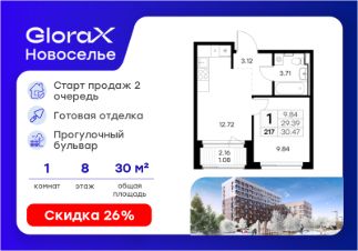 Продается 1-комн. квартира на 8-м этаже в строящемся проекте комфорт-класса GloraX Новоселье. Общая площадь лота составляет 30,47 кв. м, из которых 9,84 кв. м отведено под жилую и 12,72 кв. м под кухонную зону. Номер квартиры - 217