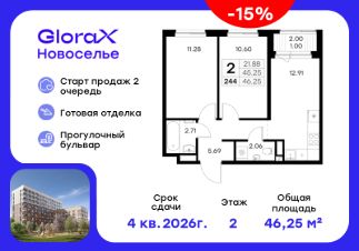 Продается 2-комн. квартира на 2-м этаже в строящемся проекте комфорт-класса GloraX Новоселье. Общая площадь лота составляет 46,25 кв. м, из которых 21,88 кв. м отведено под жилую и 12,91 кв. м под кухонную зону. Номер квартиры - 244