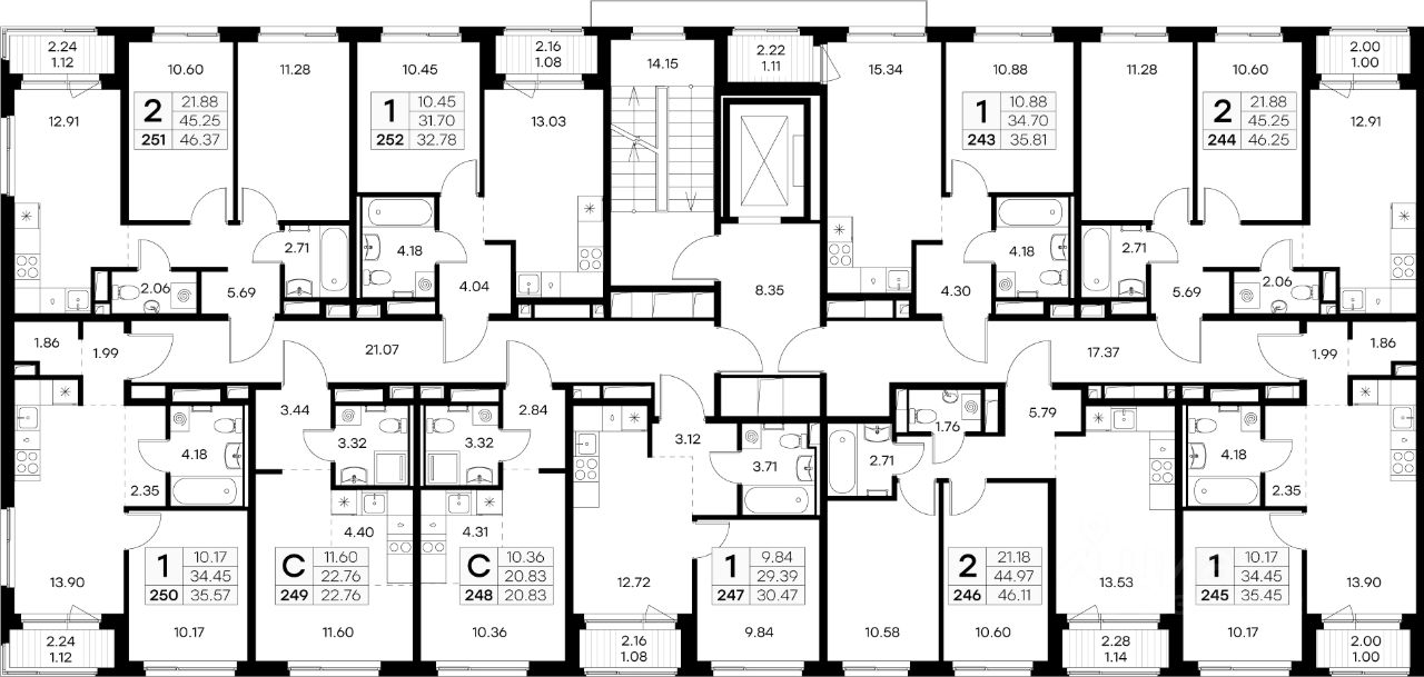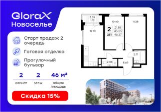 Продается 2-комн. квартира на 2-м этаже в строящемся проекте комфорт-класса GloraX Новоселье. Общая площадь лота составляет 46,37 кв. м, из которых 21,88 кв. м отведено под жилую и 12,91 кв. м под кухонную зону. Номер квартиры - 251