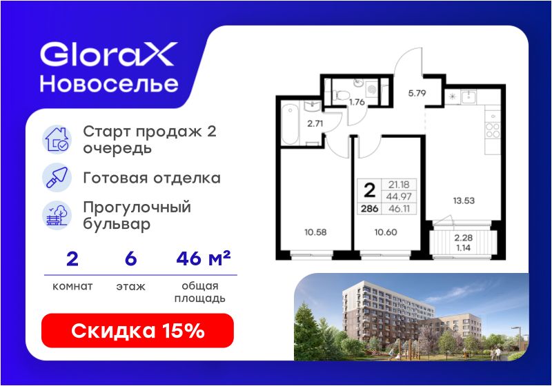 Продается 2-комн. квартира на 6-м этаже в строящемся проекте комфорт-класса GloraX Новоселье. Общая площадь лота составляет 46,11 кв. м, из которых 21,18 кв. м отведено под жилую и 13,53 кв. м под кухонную зону. Номер квартиры - 286