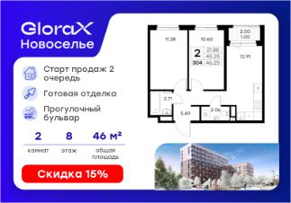 Продается 2-комн. квартира на 8-м этаже в строящемся проекте комфорт-класса GloraX Новоселье. Общая площадь лота составляет 46,25 кв. м, из которых 21,88 кв. м отведено под жилую и 12,91 кв. м под кухонную зону. Номер квартиры - 304