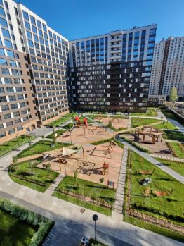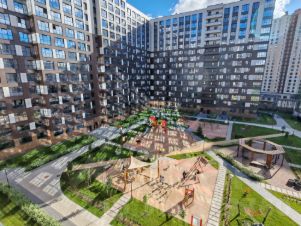 Современный квартал с благоустроенной закрытой территорией без машин, прогулочными аллеями, детскими и спортивными площадками. Всё необходимое рядом — магазины, кафе, аптеки, фитнес, школы и сады.