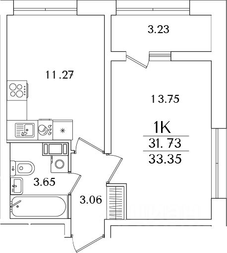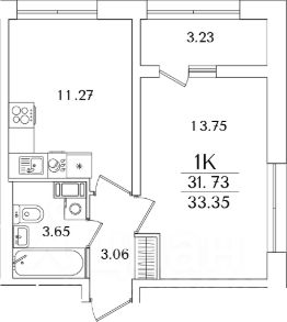 Общая приведенная комната квартиры 33.35 м2