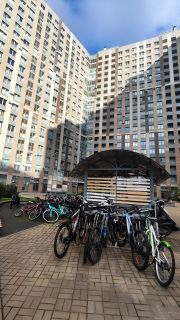 Приятный внутренний двор с зелеными насаждениями, скамейками, детской площадкой, парковка для велосипедов