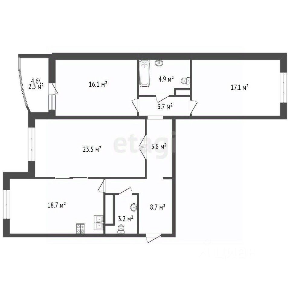- Комнаты размером 23.5 м², 16.1 м² и 17.1 м². Правильная форма позволяет с комфортом разместиться семейной паре с детьми. - Лоджия с остеклением и панорамным видом.