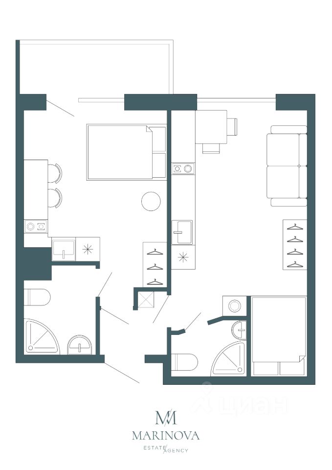 Общая площадь 42,7 м² + просторная лоджия 3,7 м².