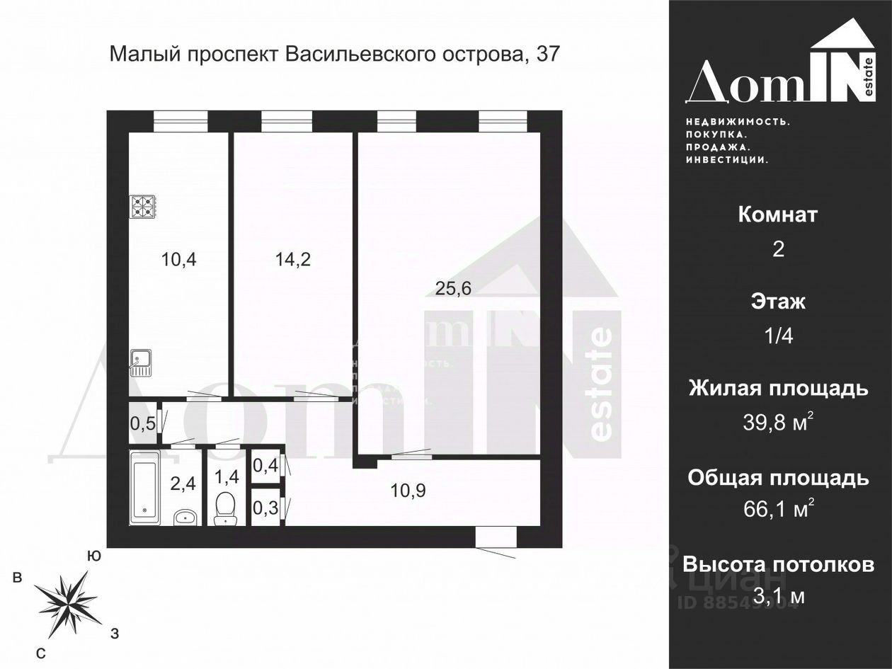 Арт. 118296792 Двушка с характером и потолками 3.1 м на Васильевском острове. Под Ваш дизайн!