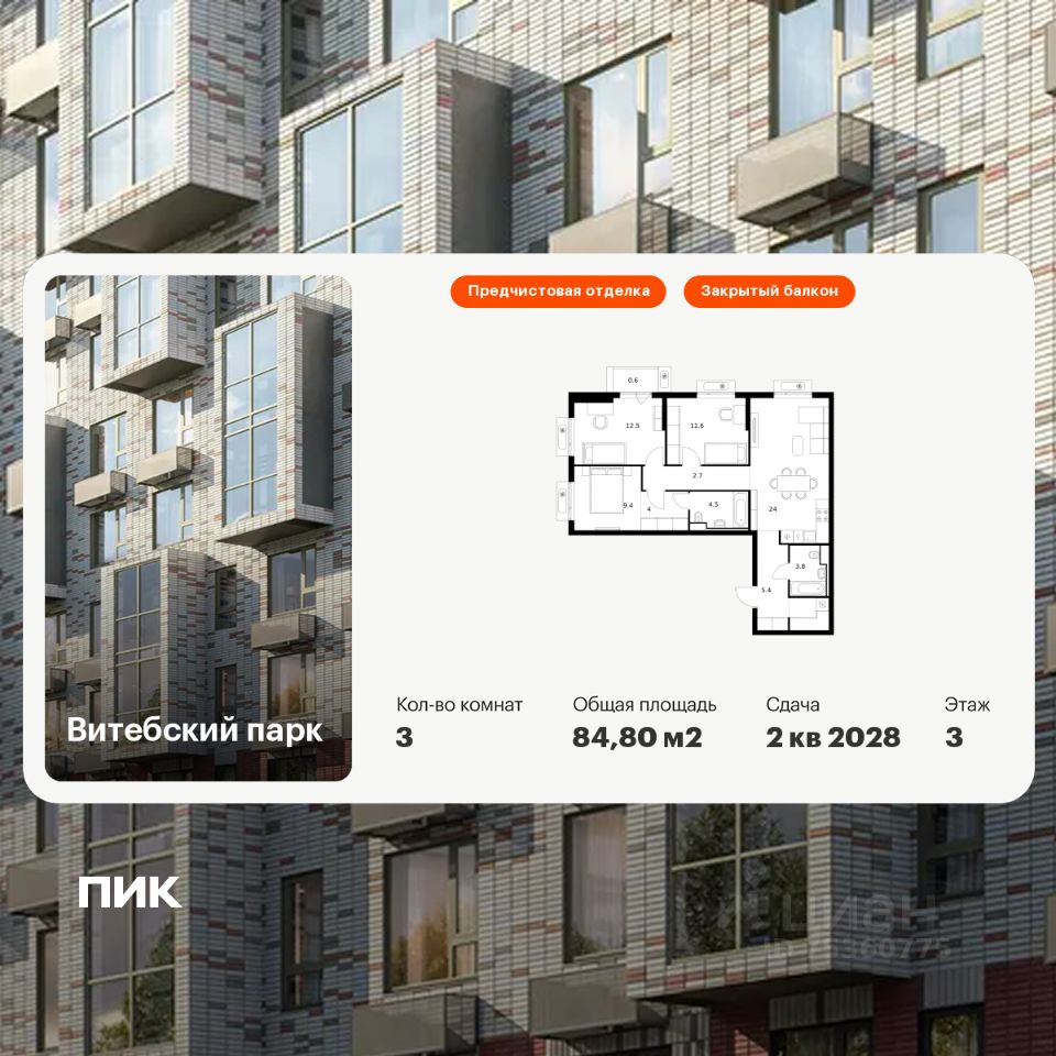 Продаётся 3-комн. квартира площадью 84,8 кв.м на 3 этаже 12 этажного дома (Корпус 6, Секция 2) проекта ПИК Витебский парк. Светлый просторный подъезд на уровне земли, функциональная планировка, большие окна, предчистовая отделка.
