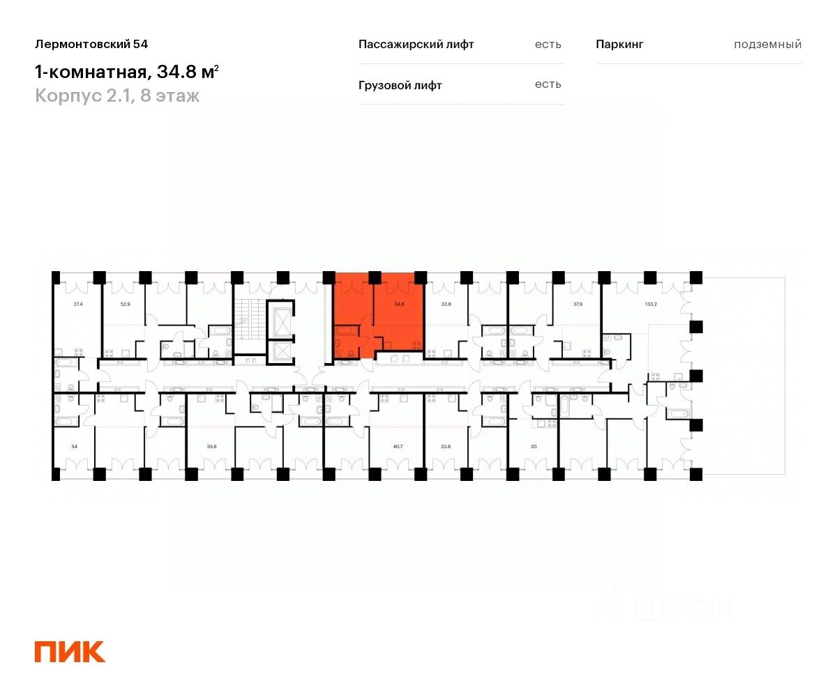 Продаётся 1-комн. квартира площадью 34,8 кв.м на 8 этаже 9 этажного дома (Корпус 2.1, Секция 2) проекта ПИК Лермонтовский 54. Светлый просторный подъезд на уровне земли, функциональная планировка, большие окна, без отделки.