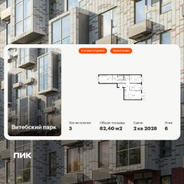 Продаётся 3-комн. квартира площадью 82,4 кв.м на 6 этаже 12 этажного дома (Корпус 7, Секция 2) проекта ПИК Витебский парк. Светлый просторный подъезд на уровне земли, функциональная планировка, большие окна, c отделкой.