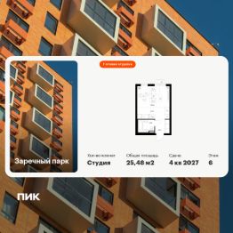 Продаётся квартира-студия площадью 25,48 кв.м на 6 этаже 15 этажного дома (Корпус 5, Секция 1) проекта ПИК Заречный парк. Светлый просторный подъезд на уровне земли, функциональная планировка, большие окна, c отделкой.
