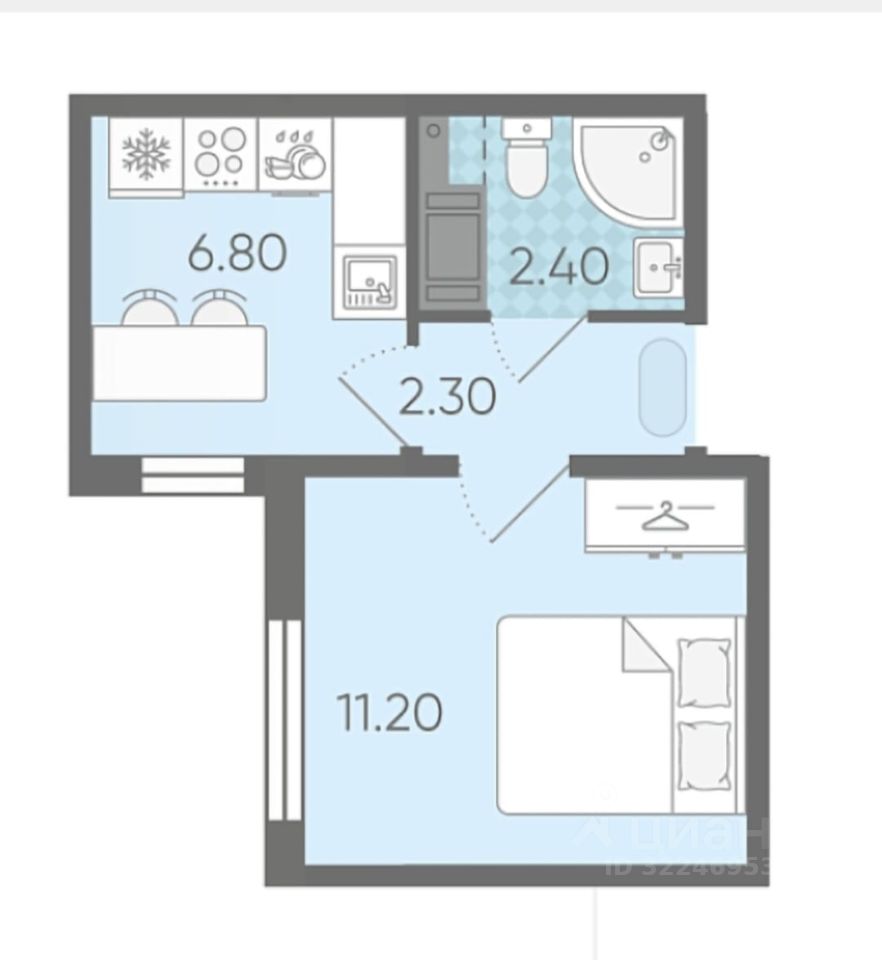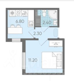 Этаж 7. Общая площадь 22,7 кв. м. , кухня 6,7 кв.м, комната 11,2 кв.м., с/у 2,4 кв.м.