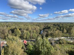 квадратная кухня 8.2 кв.м с выходом на просторный остекленный балкон с красивыми видами на лес и реку Охта;