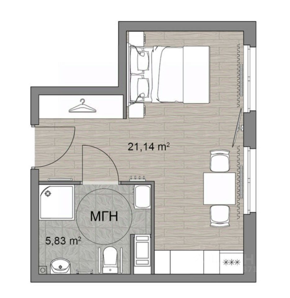 Практичная площадь 26.8 м.кв. с двумя окнами, удобное зонирование. Пространство продумано до мелочей.