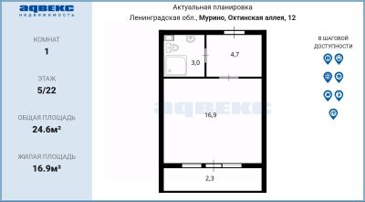 Идеальная, квадратная студия, площадью 24.6 м.кв. расположена на оптимальном 5 этаже - тепло зимой и прохладно летом. Всего 5-7 минут неспешным шагом до станции метро "Девяткино".