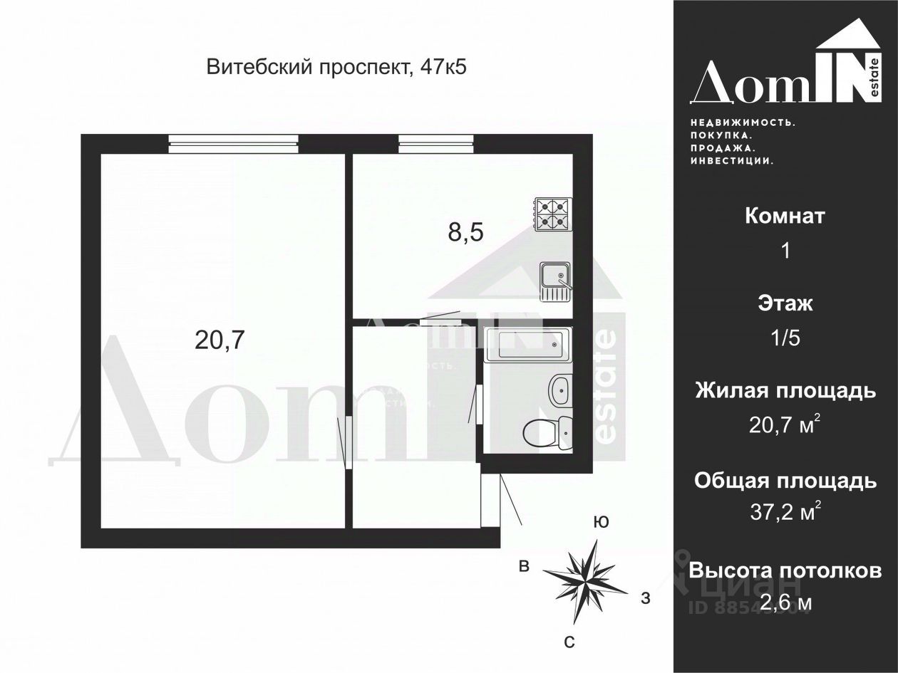 Арт. 118650836 В прямой продаже просторная однокомнатная квартира в Санкт-Петербурге, на Витебском проспекте, в зеленом уютном районе.